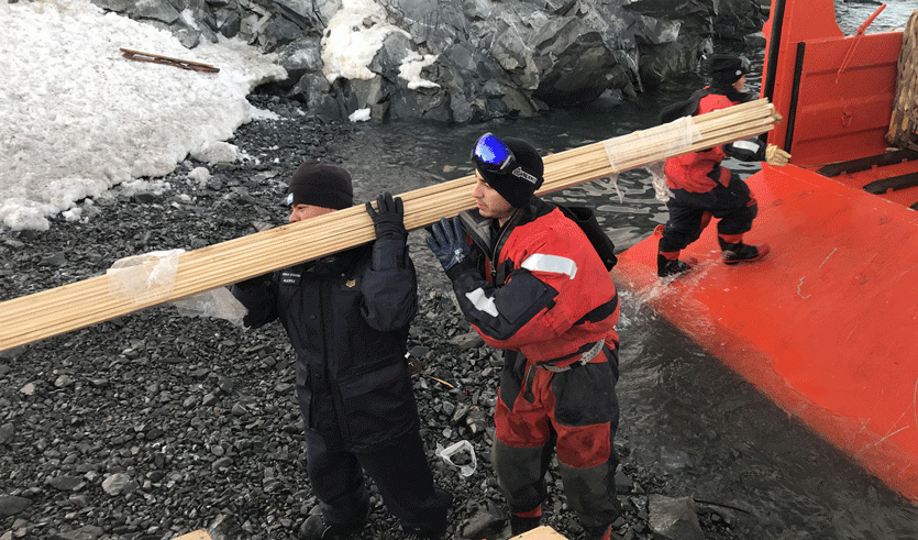 Finally, the RHAI withdrew the crews from the temporary bases Primavera and Decepción. Both lived together for a week at Provincial School No. 38 “Presidente Raúl Alfonsín,” located in the center of the BAC Esperanza. They were transported there by the aviso ARA “Puerto Argentino,” which also carried out operations alongside the icebreaker, and will remain on the ship until her arrival in Ushuaia.