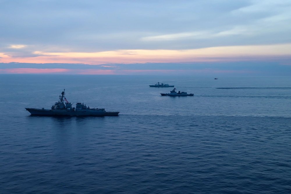 U.S. Navy’s Arleigh Burke-class guided-missile destroyer USS Howard (DDG 83), the Philippine Navy’s first-in-class frigate BRP Jose Rizal (FF 150), and the Royal Canadian Navy’s Halifax-class frigate HMCS Vancouver (FFH-331) steam in formation as part of a maneuvering exercise in the South China Sea during Sama Sama 2024, Oct. 16, 2024. Sama Sama is a bilateral exercise hosted by the Philippines and the United States with participants from Australia, Canada, France and Japan, designed to promote regional security, cooperation, maintain and strengthen maritime partnerships, and enhance maritime interoperability. (U.S. Navy photo by Naval Air Crewman (Helicopter) 2nd Class Brenden Dalrymple)
