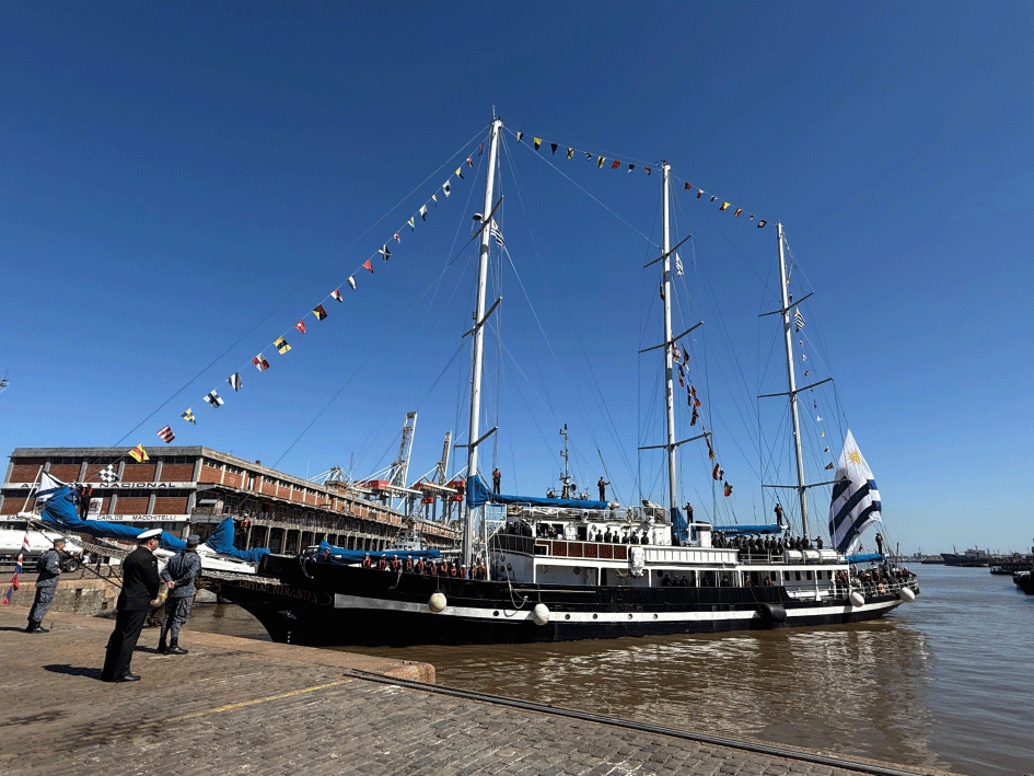 After six months at sea and with 80 crew members on board, the training ship “ROU 20 Capitán Miranda” arrived at the port of Montevideo. They were received by the President of the Republic, Yamandú Orsi, the Minister of National Defense, Sandra Lazo, and the crew’s families.