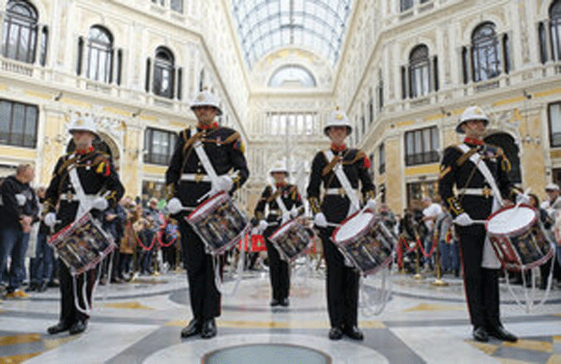 The Band of the Royal Marines Scotland entertained residents and visitors with a performance in the recently restored Galleria Umberto I. Known for its precision and versatility, the band presented a repertoire combining traditional military marches with contemporary pieces, creating a unique cultural and entertainment moment in the heart of Naples.