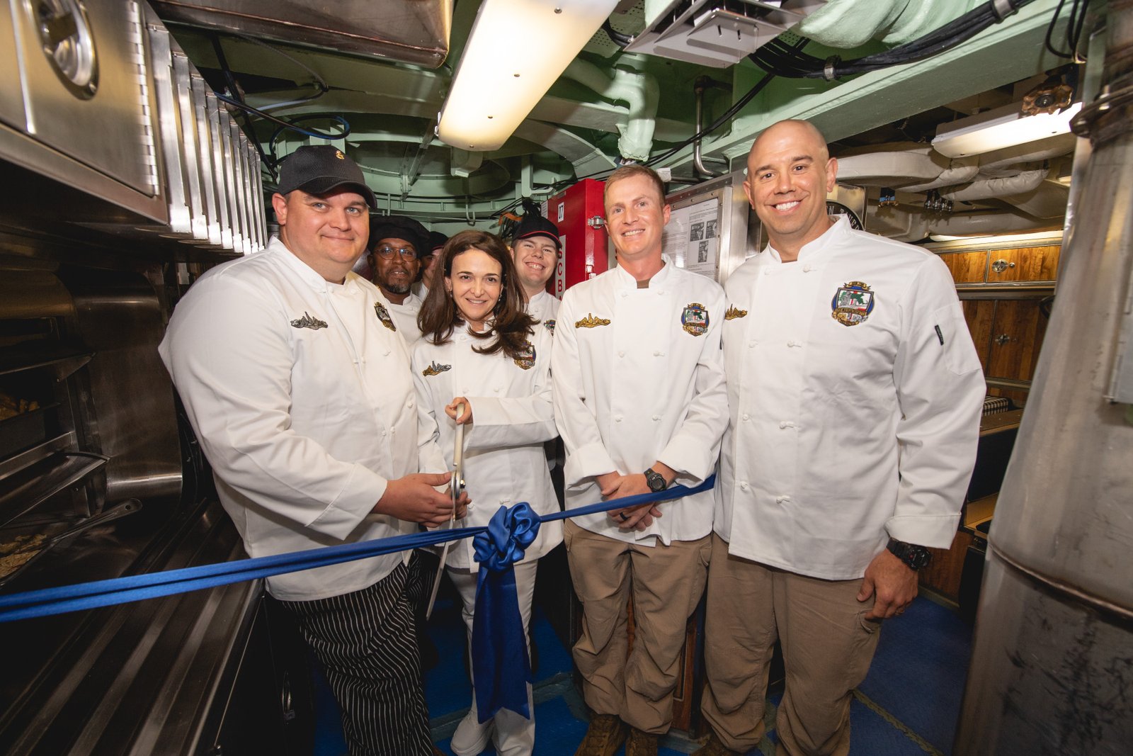 “It’s exciting to celebrate another step towards bringing Massachusetts to life,” said Cmdr. Michael Siedsma, commanding officer of the pre-commissioning unit. “The crew has worked very hard to transition to full shipboard operations, and the injection of morale and increased camaraderie that comes with sharing a meal prepared onboard is phenomenal to witness. It’s energizing that we were joined by our sponsor, Sheryl, as well as her husband and son. I am grateful for the time they spent learning about the ship and the sailors who make our mission possible, as well as their continued support.”