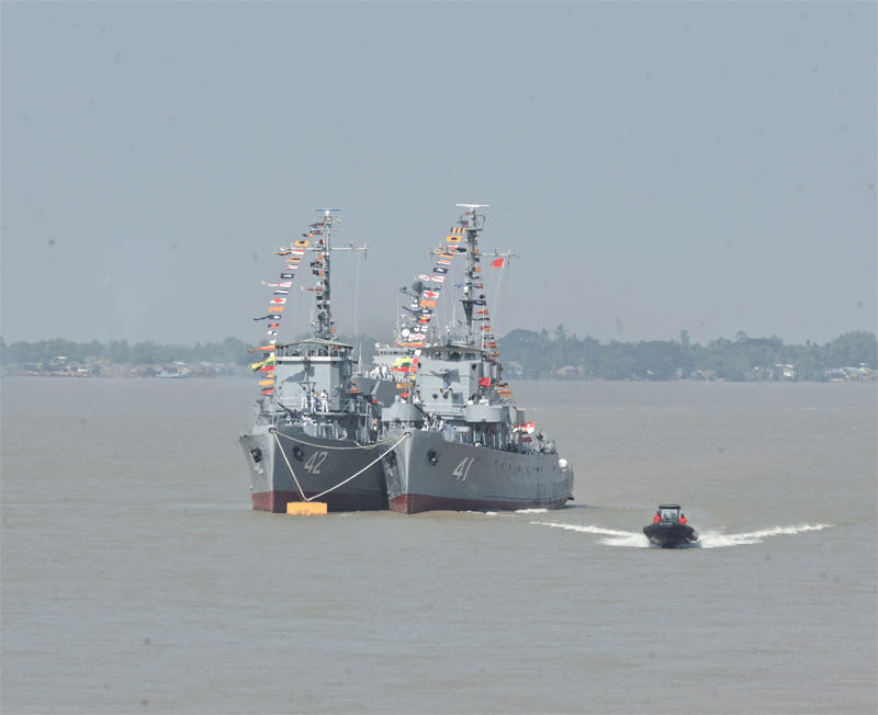 Frigate Kyansittha, Frigate Hsinbyushin, Corvette Tabinshwehtee, Offshore Patrol Boat Inlay and Submarine Destroyer Yan Ye Aung led by Frigate Aungzeya in a single line formation and two war vessels and four fast patrol vessels led by the 49-metre fast attack missile vessel 491 in a lineabreast formation saluted the Senior General.