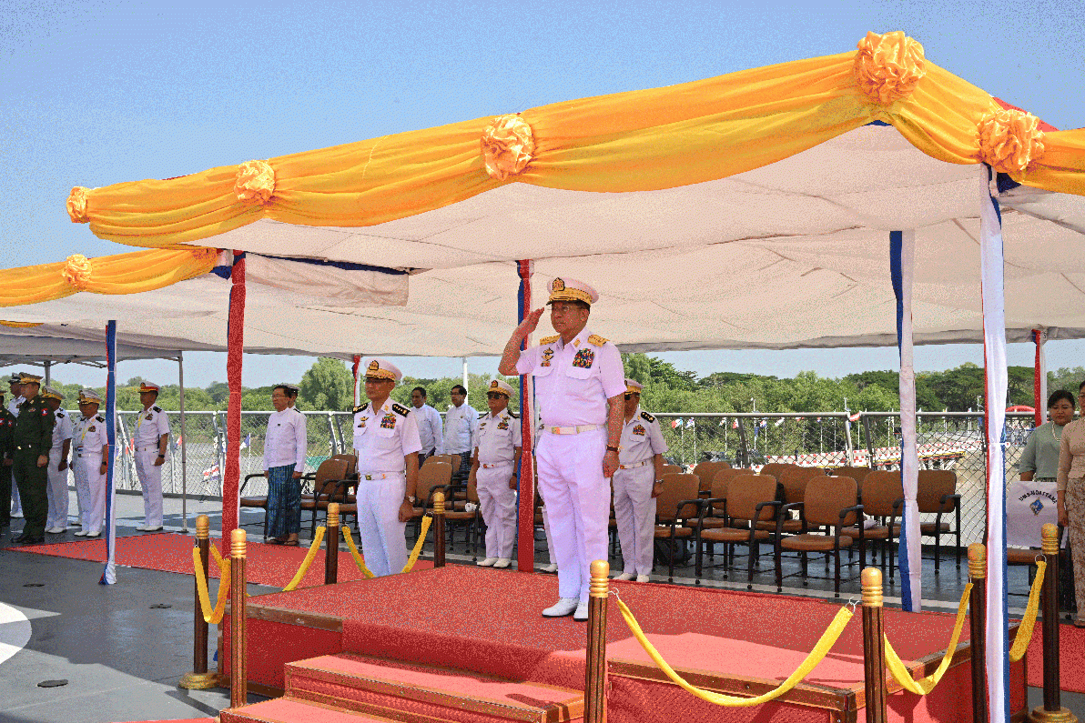 The Senior General from the dais aboard War Vessel Mottama took the salute of the Guard of Honour. Meanwhile, the Senior General was saluted with a 21-gun fire by War Vessels Yan Taing Aung and Yan Gyi Aung.