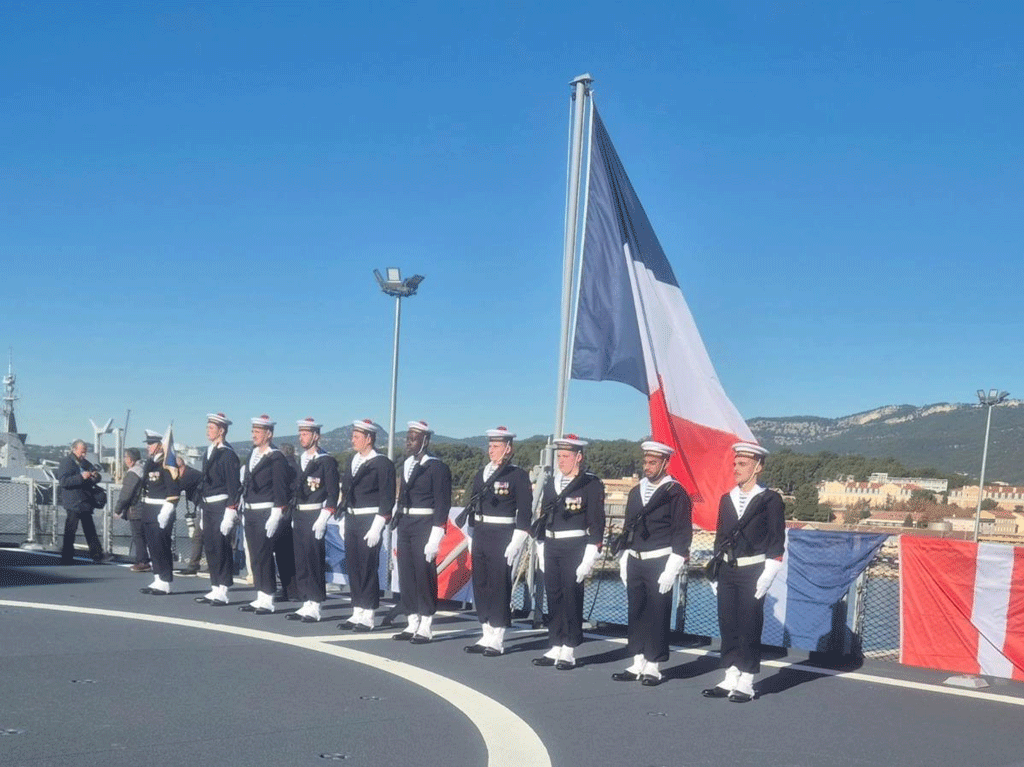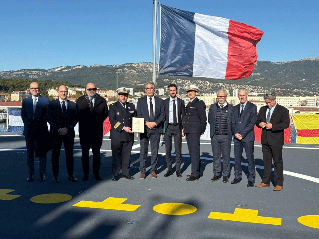 This event took place on board the ship from the Toulon Naval Base in the presence of the Vice Amiral D´Escadre (VAE) Christophe Cluzel, Commandant la force d´action navale, Ingenieur general de lármement (DGA – Direction générale de l’armement) Francois Watteau, the OCCAR-EA Director, Joachim Sucker, Laurent Castaing, CEO of Chantiers de l’Atlantique, and Stephane Fremont, Directeur des navires de combat de surface of the NAVAL GROUP and members of Jacques Stosskopf’s family.