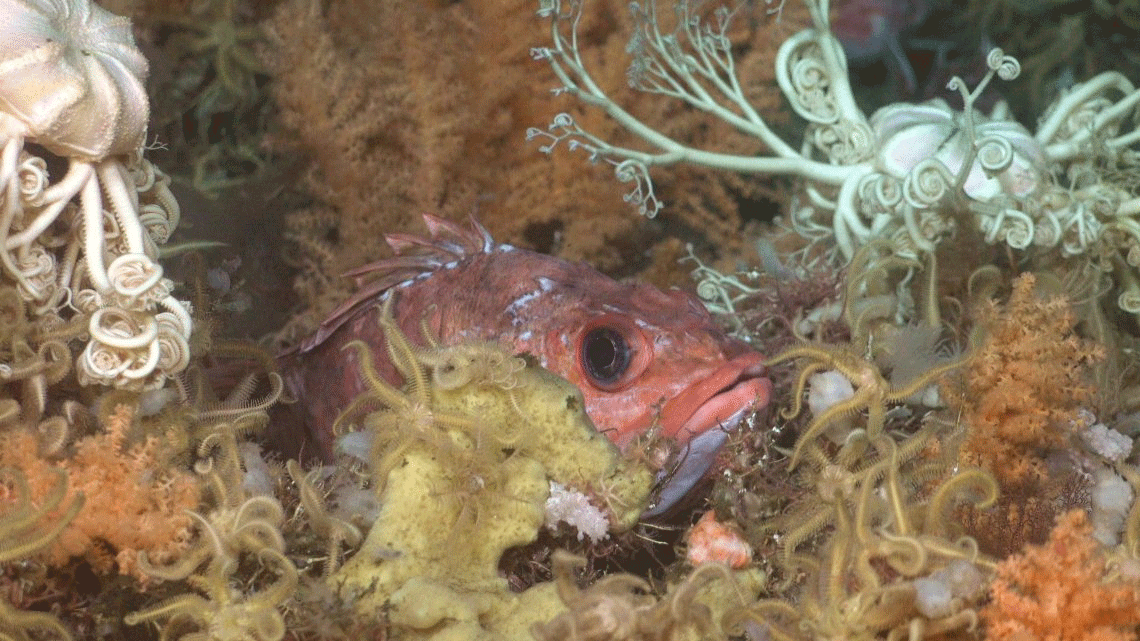A scene of biodiversity includes fish, sea stars, sponges, and corals, documented at the head of a canyon off the coast of Argentina. The research team used Schmidt Ocean Institute’s remotely operated vehicle (ROV) SuBastian to observe the biodiversity and collect samples in the canyons. With the high-resolution ROV cameras, they discovered coral-covered walls, black sediment that spewed bubbles, suggesting the presence of methane seeps, and schools of fish.