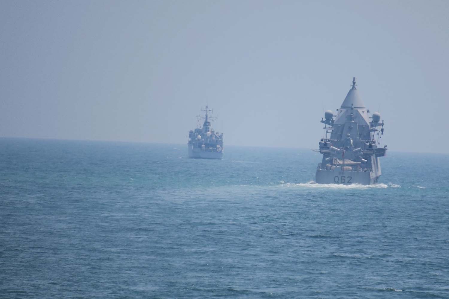 The guided-missile frigates Dali (Hull 553) and Chenzhou (Hull 552) attached to a naval frigate flotilla under the Chinese PLA Southern Theater Command conduct double-banking operations at sea during a training exercise in middle May, 2025. (eng.chinamil.com.cn/Photo by Cai Shengqiu)