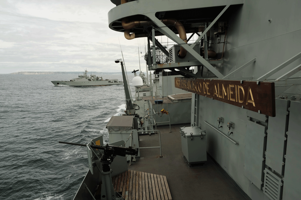 Simultaneously, specific exercises were conducted between the NRP D. Francisco de Almeida and the NRP Sines, with the aim of training and certifying the Navigation Specialist Officers, including anchorage approach maneuvers, approach for replenishment at sea (RAS) and navigation in restricted waters.