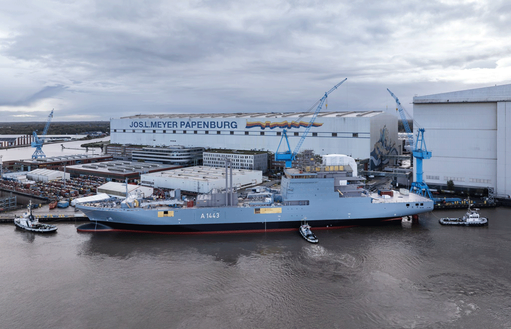 The 173-metre-long naval unit of the Type 707 was successfully launched last month at our MEYER WERFT, in Papenburg. As with the sister ship, final equipment, commissioning, and testing will take place at the NEPTUN WERFT in Rostock, which belongs to the Meyer Werft Group.