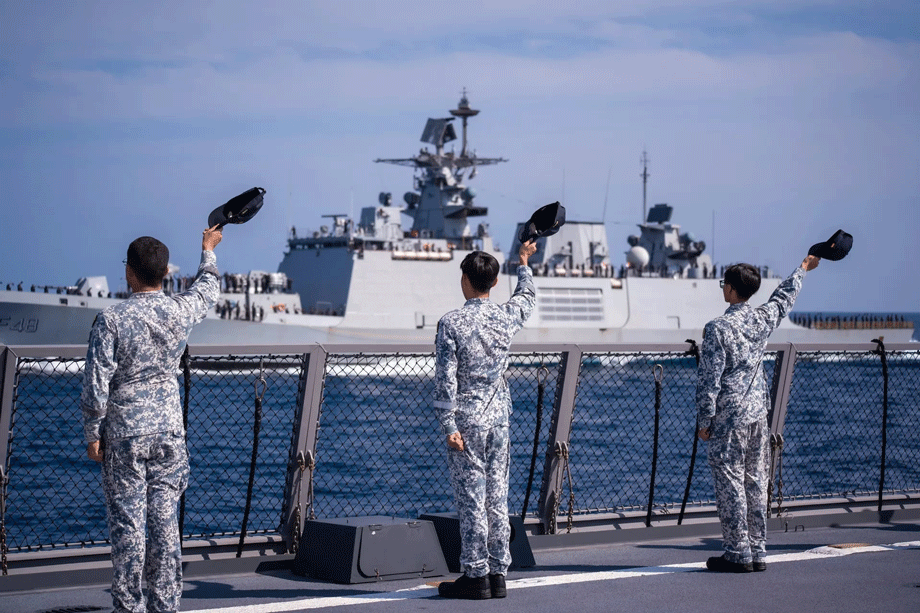 RSN personnel aboard RSS Supreme waving to counterparts on INS Satpura during the sail-past. Singapore Navy photo.