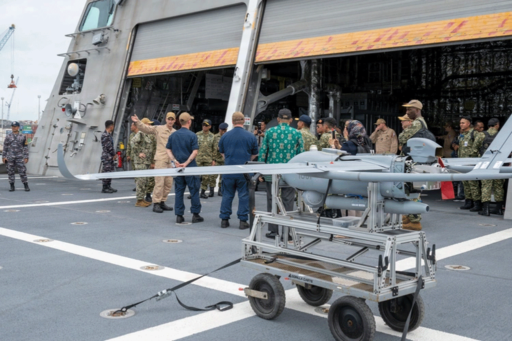 U.S. Navy Cmdr. Andrew Recame, left, commanding officer of Independence-variant littoral combat ship USS Cincinnati (LCS 20), gives a tour to Indonesian National Armed Forces aboard Cincinnati during the Association of Southeast Asian Nations (ASEAN)-U.S. Maritime Exercise (AUMX) 2025, in Batam, Indonesia, Dec. 10, 2025. This is the second iteration of AUMX, designed to promote shared commitments to maritime partnerships, security, and stability in Southeast Asia. (U.S. Navy photo by Mass Communication Specialist 2nd Class Anthony Robledo)